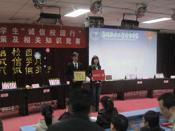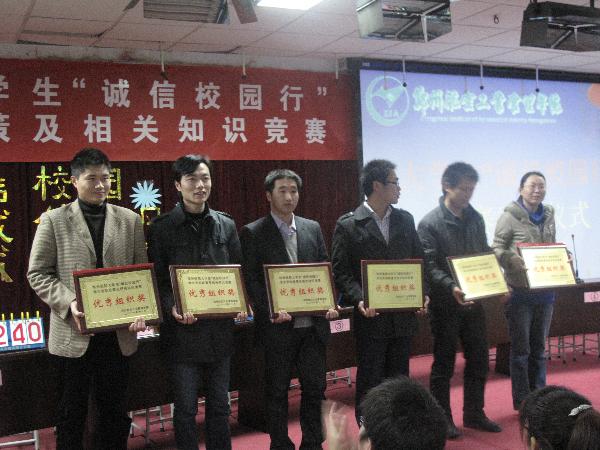 12月5日晚,郑州航院大学生“诚信校园行”学生资助政策及相关知识竞赛在我校东区01A203教室圆满落幕。郑州航院副院长王霞、学生处处长王志强、副处长王焱源、校团委副书记吴红兵及各院系党总支副书记、贷款专员共同观看了此次比赛。