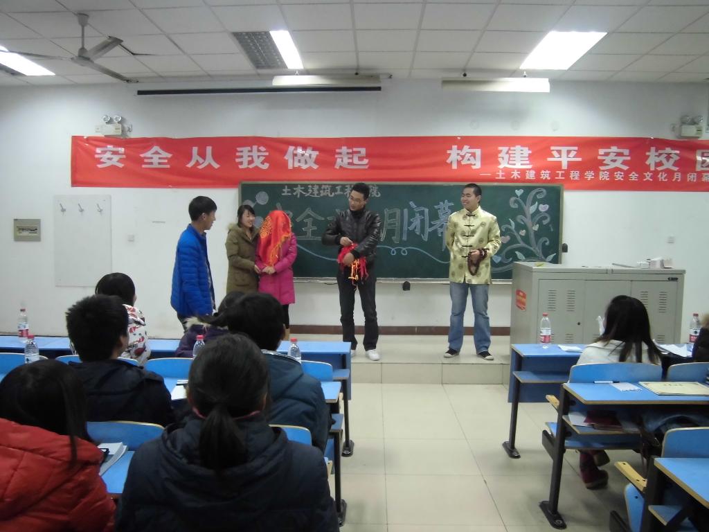 闭幕式开始,古装话剧“绣球选亲”引来现场观众掌声喝彩声不断,同学们在欢笑中学到安全知识,懂得了安全对于生活的重要性。12级辅导员助理黄迪发言,她对学院本届安全文化月活动的开展表示肯定,并希望全体同学能在活动中有所收获,将安全植于心中,落实于行动中。主持人带领大家对本次安全文化月活动作了回顾。这十几天的点点滴滴让大家难忘,这十几天的努力让大家铭记,这十几天收获的安全知识更是让每个人终生受益。接着,学院团总支学生会副主席宋高阳、辅导员助理黄迪等人为本次安全文化月中表现出来的优秀团体及个人颁发奖品及证书。随后,主持人代表学院向全体同学提出几点建议,希望每个人能将安全记于心,践于行。