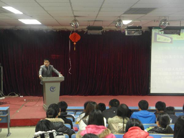 为建立良好的考风考纪,率先树立同学们诚信考试的意识。12月13日中午土木工程建筑学院在我校东区01A203教室召开了题为“大学英语四级与期末考试诚信教育”的诚信考试誓师大会。到场嘉宾有土建学院党总支副书记张先忠,10级辅导员徐亚辉。土建学院10级全体学生参加了此次会议。