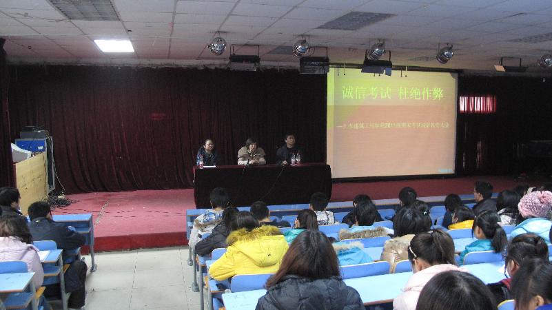 为建立良好的考风考纪,树立11级新生诚信考试的意识。12月22日上午10:00土木建筑工程学院2011级期末考试诚信教育动员大会在我校东区01A203教室成功召开,土木建筑工程学院党总支副书记张新红、张先忠,08级辅导员刘方方,11级辅导员张丽娜及全体大一学生参加了此次会议。
