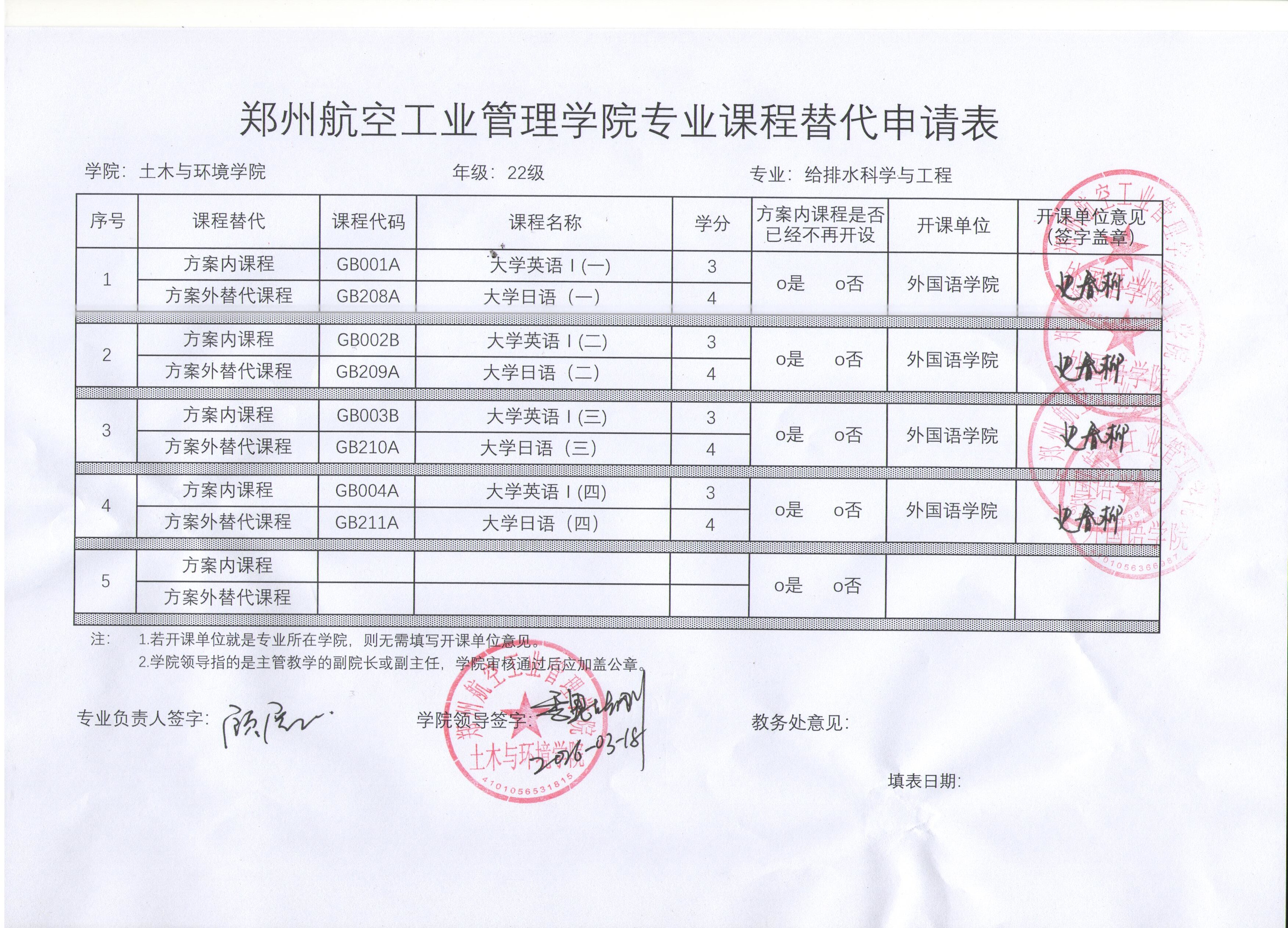 2022级给排水科学与工程专业课程替代