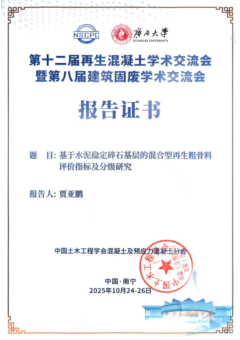 在研究生论坛环节,贾亚鹏同学作题为《基于水泥稳定碎石基层的混合型砖混再生粗骨料评价指标及分级研究》的学术报告。报告内容深入、思路清晰,展示了其在再生材料评价与分级研究方面的成果,进一步拓宽了学术视野,促进了青年学者间的学术交流与思想碰撞。