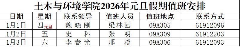 为进一步规范学院值班工作,现将学院2026年元旦假期值班工作有关事项通知如下: