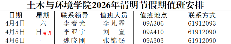 为进一步规范学院值班工作,现将学院2026年清明节假期值班工作有关事项通知如下: