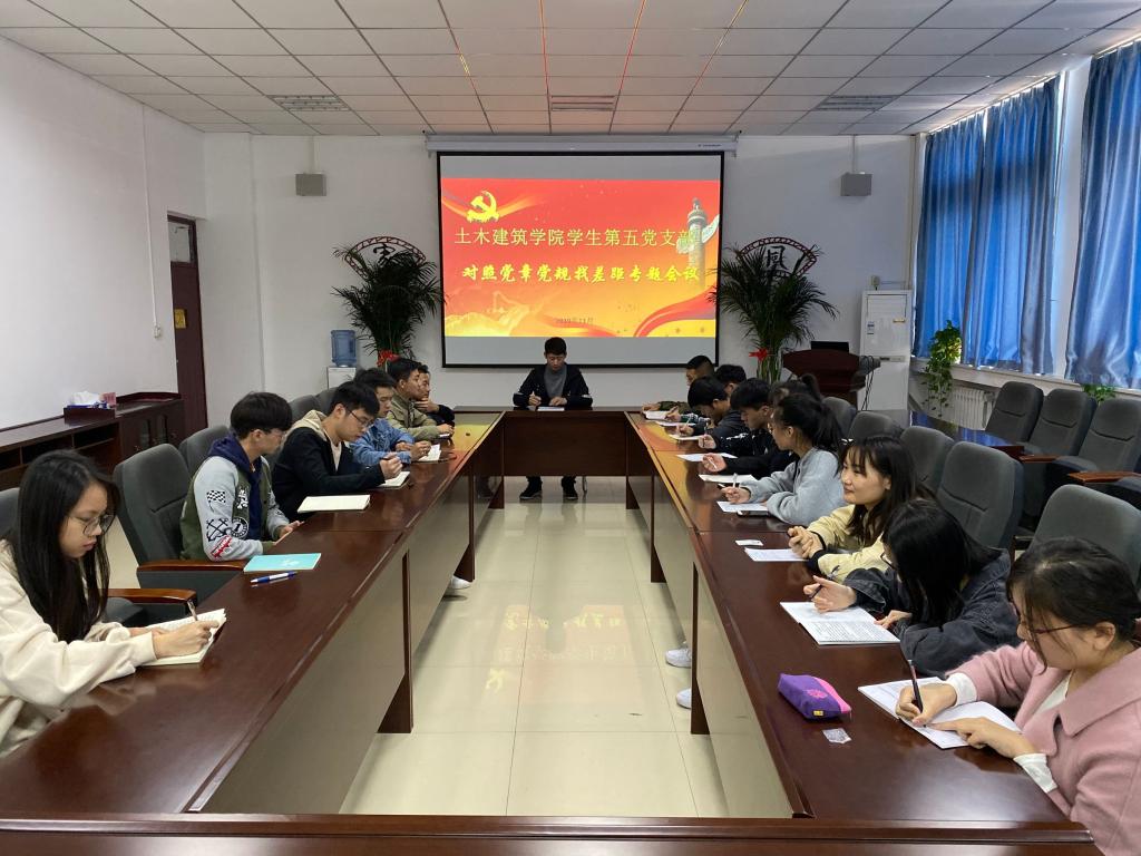 按照党中央决策部署和省委“不忘初心、牢记使命”主题教育工作安排,11月4日上午,土木建筑学院学生第五党支部在05C416会议室召开对照党章党规找差距专题会议,深入学习领会习近平总书记关于“不忘初心、牢记使命”重要论述,对照党章和有关党内法规,紧扣“18个是否”,结合实际情况逐条对照检视,明确整改措施和努力方向,以正视问题的自觉和刀刃向内的勇气,对照党章党规找差距,扎实推动主题教育不断走深走实。支部书记夏园明主持会议并带头作对照检视。